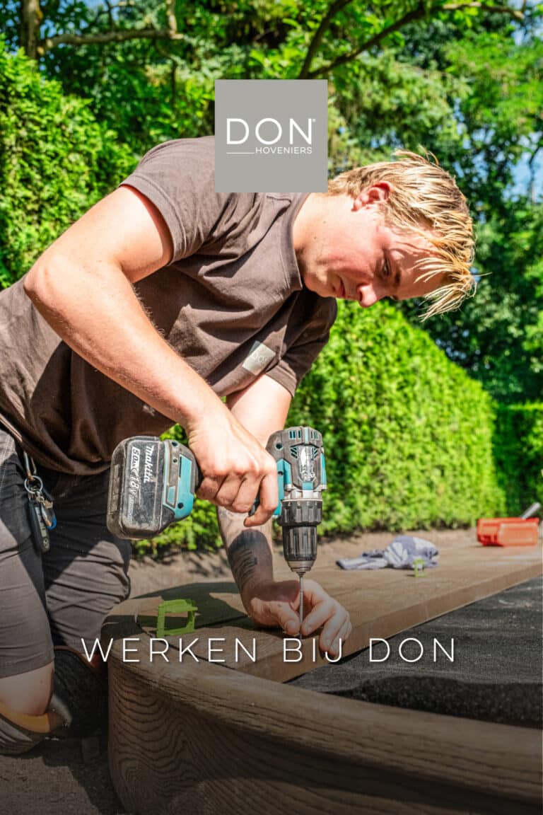 “Afwerking maakt het verschil in een tuin” Gerben werkt sinds augustus vorig jaar bij DON Hoveniers. Binnen een jaar groeide hij uit tot een nauwkeurige vakman met oog voor detail. Zijn kracht? Strakke afwerking, samenwerken en het compleet ontzorgen van de opdrachtgever.