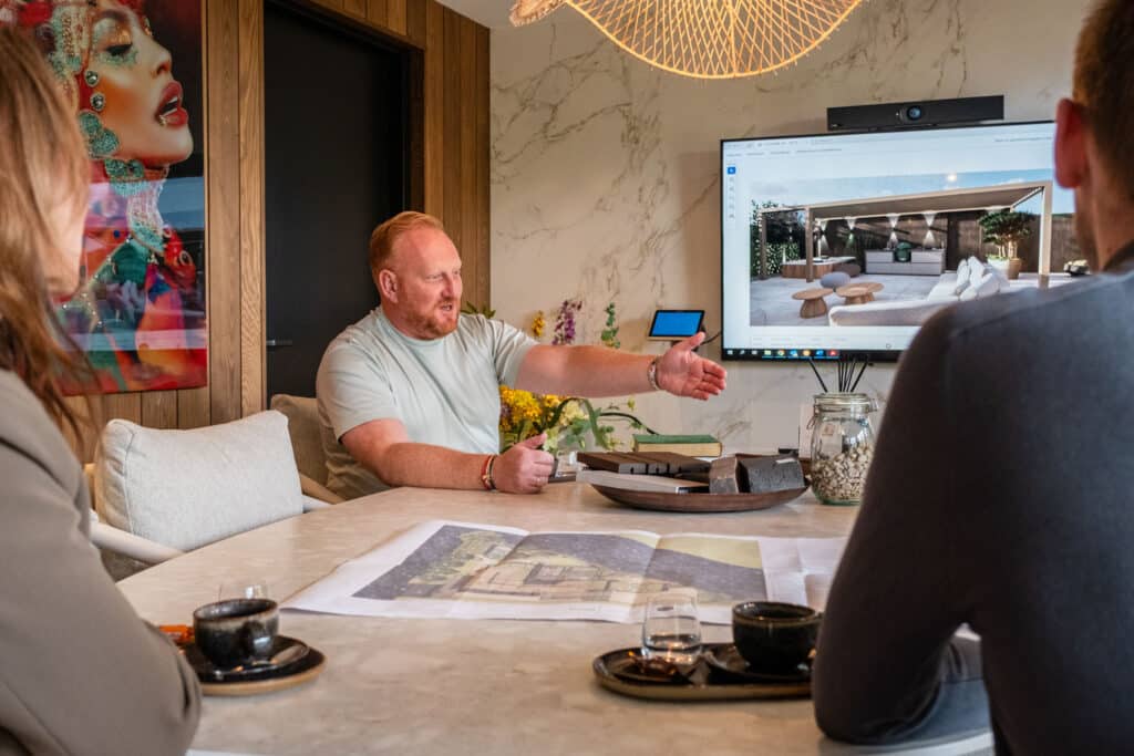 Een afspraak begint met een goed gesprek. Samen wordt gekeken naar de stijl van de woning, de wensen voor buiten en de technische voorbereiding. Zo ontstaat een helder beeld van wat er mogelijk is — van ontwerp tot aanleg.